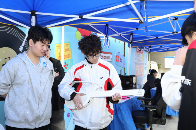 活动现场设置了产品展示体验区、新奇装备体验站、电竞挑战赛、电子吉他弹唱会等多个互动板块。在体验区内,师生们或在春日花艺背景中弹唱民谣,或戴上VR眼镜沉浸式欣赏春日风光大片,或在围棋机器人挑战区与AI对弈,在科技与传统智慧的碰撞中感受乐趣。此外,活动还贴心设置了最美证件照拍摄打印、免费贴膜清洁、免费书籍赠送等服务板块,并开展趣味刮刮乐活动,进一步提升互动氛围。师生们在近距离感受前沿科技魅力的同时,也可通过“以旧换新”等优惠政策实现消费产品设备以旧换新,满足日常学习、工作与生活的多元需求。